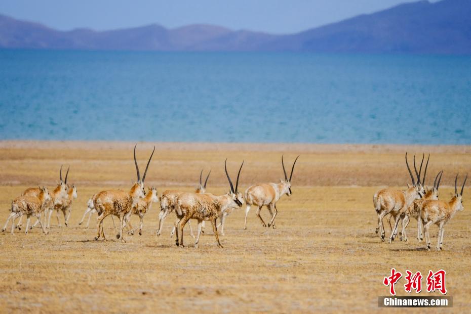 圖為(wei) 5月2日,西藏那曲色林錯湖邊的藏羚羊群。江飛波 攝