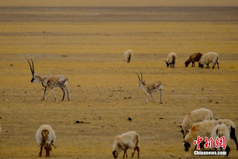 圖為(wei) 兩(liang) 隻藏羚羊混入牧民羊群中一起覓食。江飛波 攝