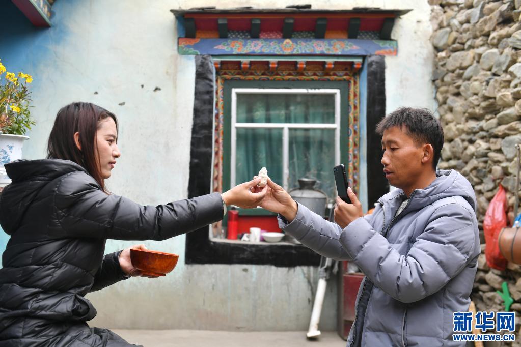 紮西拉姆(左)把剛揉好的糌粑遞給拍攝短視頻的丈夫田輝(4月2日攝)。新華社記者 孫瑞博 攝