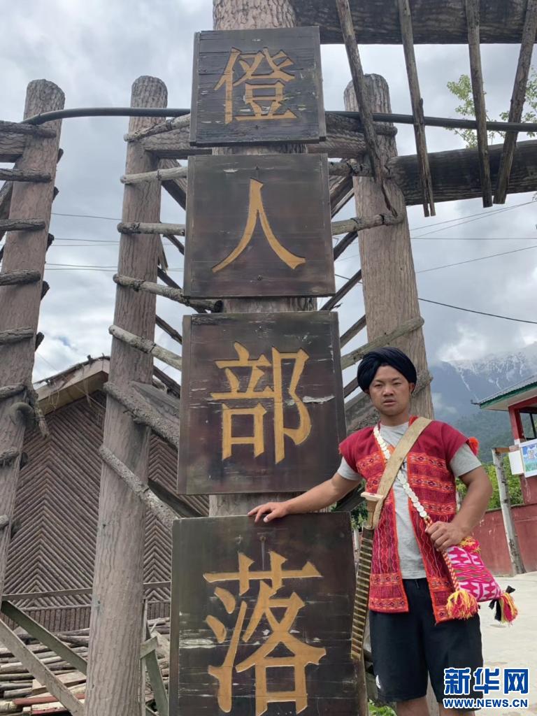 迪龍身著僜人傳(chuan) 統服飾站在村莊門口。 新華社發