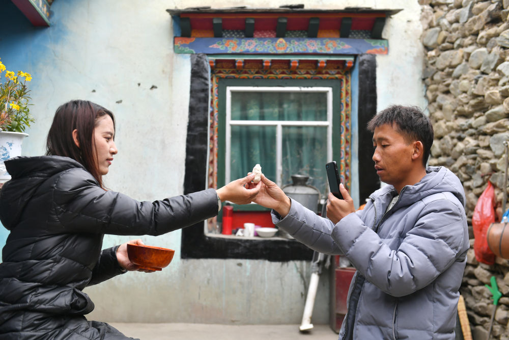 紮西拉姆(左)把剛揉好的糌粑遞給拍攝短視頻的丈夫田輝(4月2日攝)。新華社記者 孫瑞博 攝