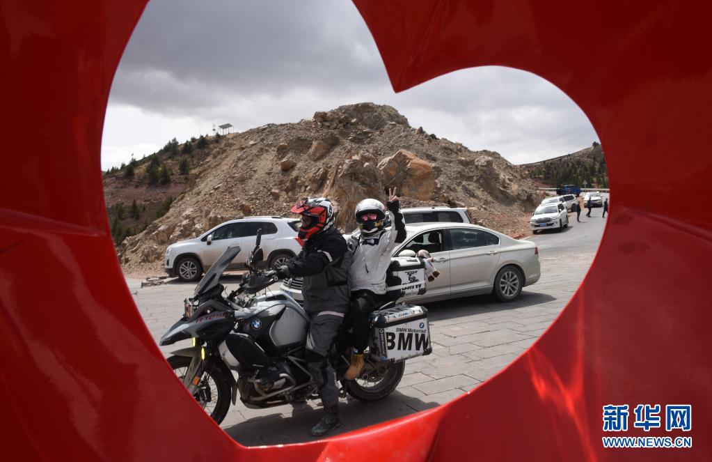 在西藏芒康縣拉烏(wu) 山,騎行摩托的年輕人在一起合影(5月2日攝)。新華社記者 陳燮 攝