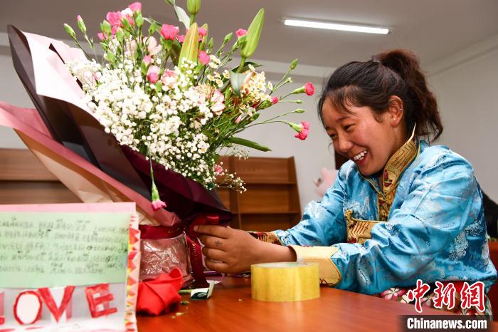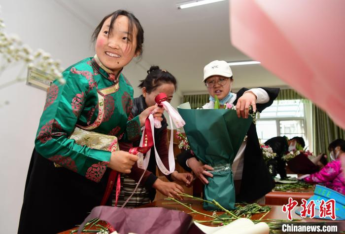 圖為(wei) 兒(er) 童福利院的孩子們(men) 跟自己的“媽媽”包裝製作鮮花花束。貢嘎來鬆 攝