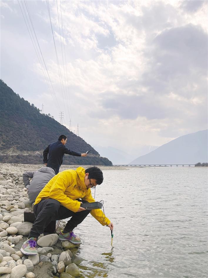 監測組人員在川藏鐵路附近重要水體(ti) 開展現場監測。
