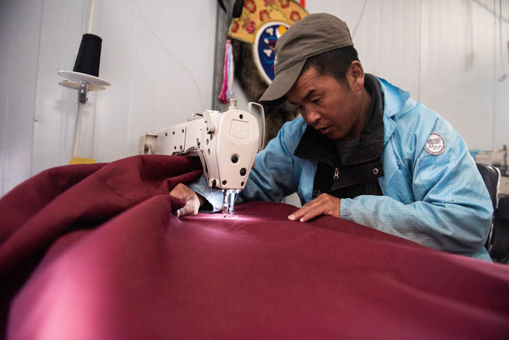 走進廠房,隻能聽見縫紉機轉動的聲音。平措占堆坐在縫紉機前,雙眼盯著跳動的針頭,手推深紅色布料伸展開去,這是製作藏式門簾的步驟之一。