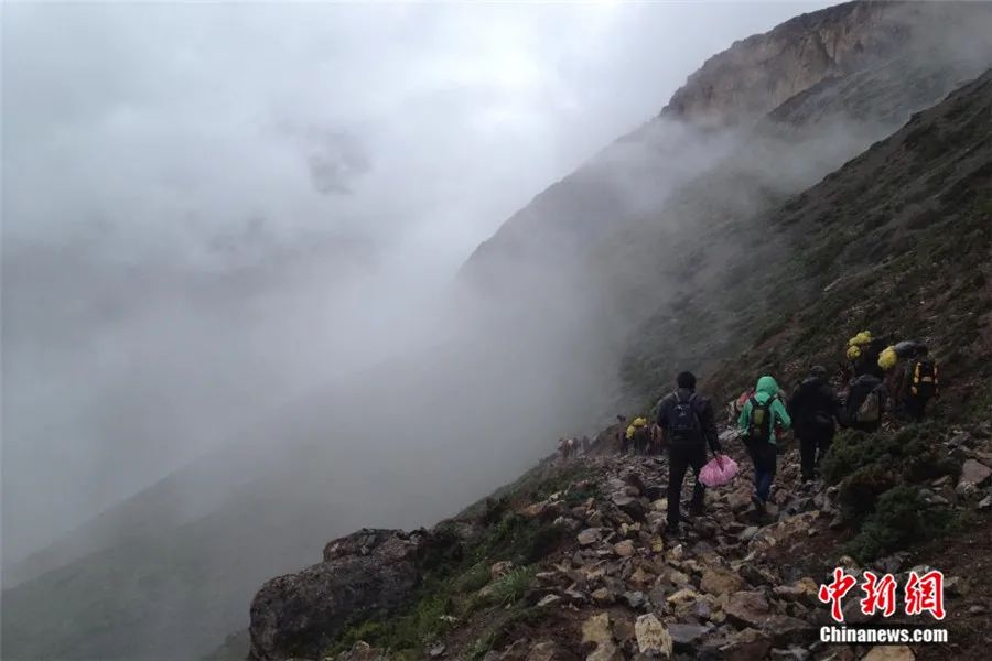 2013年,工作人員在日喀則茹村進行古籍普查。山洪暴發衝(chong) 毀道路,大家走在山間的亂(luan) 石上。受訪者供圖