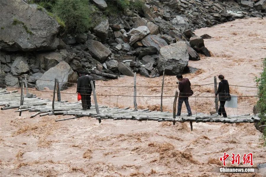 2014年,工作人員赴那曲比如縣進行古籍普查,經過怒江上一座簡易浮橋。受訪者供圖。