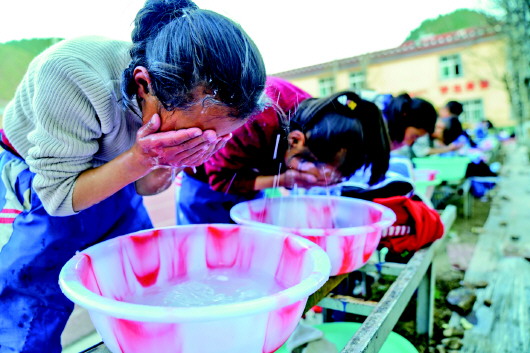 4月30日,在類烏(wu) 齊縣桑多鎮第二小學,學生們(men) 用熱水洗漱。這套熱水設施由李純民發起的“齊興(xing) ”助學獎勵基金捐助。 記者劉金海、黃臻攝