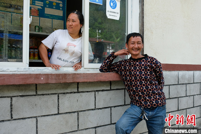 圖為(wei) 5月16日,西藏墨脫縣墨脫鎮門巴族民眾(zhong) 紮巴和妻子梅朵曲珍在自家小商店門口,通公路前紮巴是一位背夫。 中新社記者 江飛波 攝