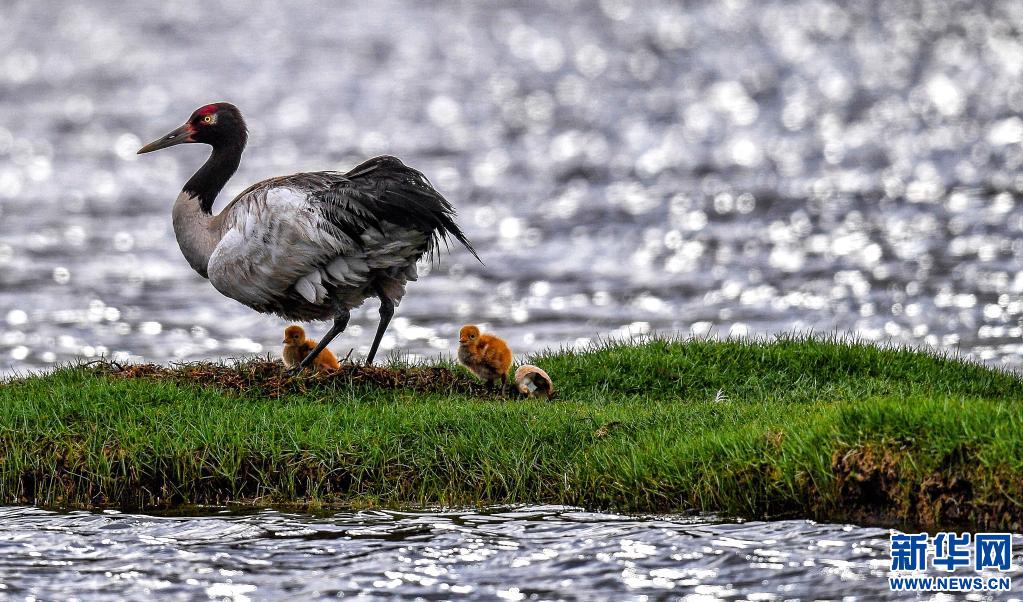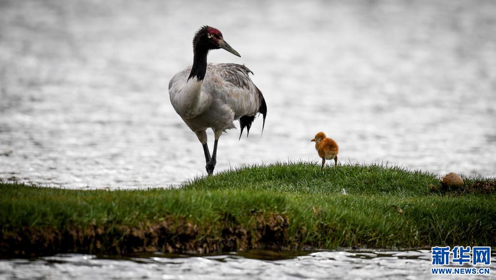 成年黑頸鶴帶著小黑頸鶴在藏北羌塘草原覓食。(新華社記者 普布紮西 攝)