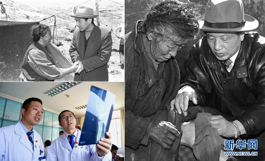 這是一張拚版照片:左上圖為(wei) 來自陝西的援藏幹部阿裏日土縣副縣長賈冗勇深入牧區,幫助藏族牧民解決(jue) 生產(chan) 、生活的實際困難(新華社記者土登攝 1997年11月11日發);左下圖為(wei) 2017年8月3日,北京積水潭醫院援藏醫生龔曉峰(右)和北京天壇醫院援藏醫生李家謀在拉薩市人民醫院骨科病房內(nei) 查看患者的X光片,進行工作交接(新華社記者晉美多吉攝);右圖為(wei) 孔繁森(右)在阿裏日土縣過巴鄉(xiang) 為(wei) 孤寡老人益西卓瑪治病(新華社記者土登攝 1994年12月26日發)。新華社發