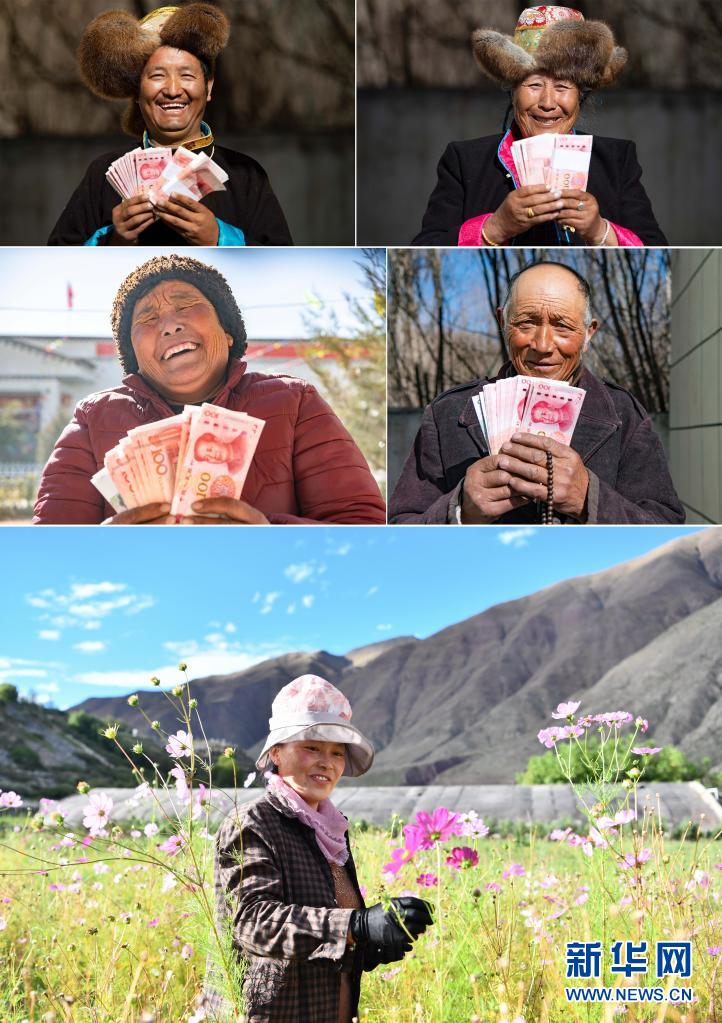 這是一張拚版照片:上四圖為(wei) 2021年2月9日,山南市乃東(dong) 區克鬆社區領到分紅的農(nong) 民興(xing) 高采烈(新華社記者普布紮西攝);下圖為(wei) 西藏昌都市察雅縣卡貢村村民在當地苗圃產(chan) 業(ye) 基地采集鮮花種子,曾經的建檔立卡貧困戶在這裏實現了就業(ye) ,完成了脫貧(2020年9月28日 新華社記者晉美多吉攝)。新華社發