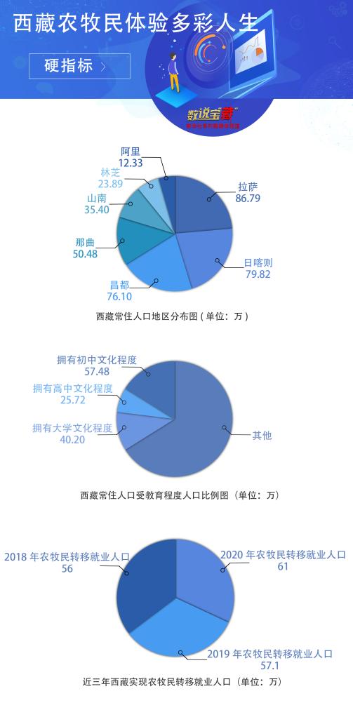 數據顯示,西藏和平解放70年來,常住人口從(cong) 100多萬(wan) 人增加到364.81萬(wan) 人。2019年底,西藏74個(ge) 貧困縣全部摘帽,62.8萬(wan) 建檔立卡貧困人口全部脫貧。2020年,西藏地區生產(chan) 總值突破1900億(yi) 元,同比增長7.8%。
