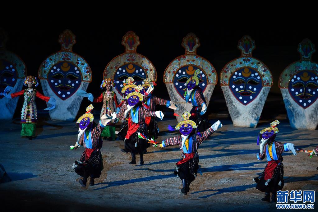 大型實景劇《文成公主》演職人員共計800餘(yu) 名,除專(zhuan) 職演員外,很多當地藏族農(nong) 牧民參與(yu) 演出,有效促進了當地群眾(zhong) 就業(ye) 增收。圖為(wei) 演員在劇中表演藏戲(2019年10月31日攝)。新華社記者 李鑫 攝