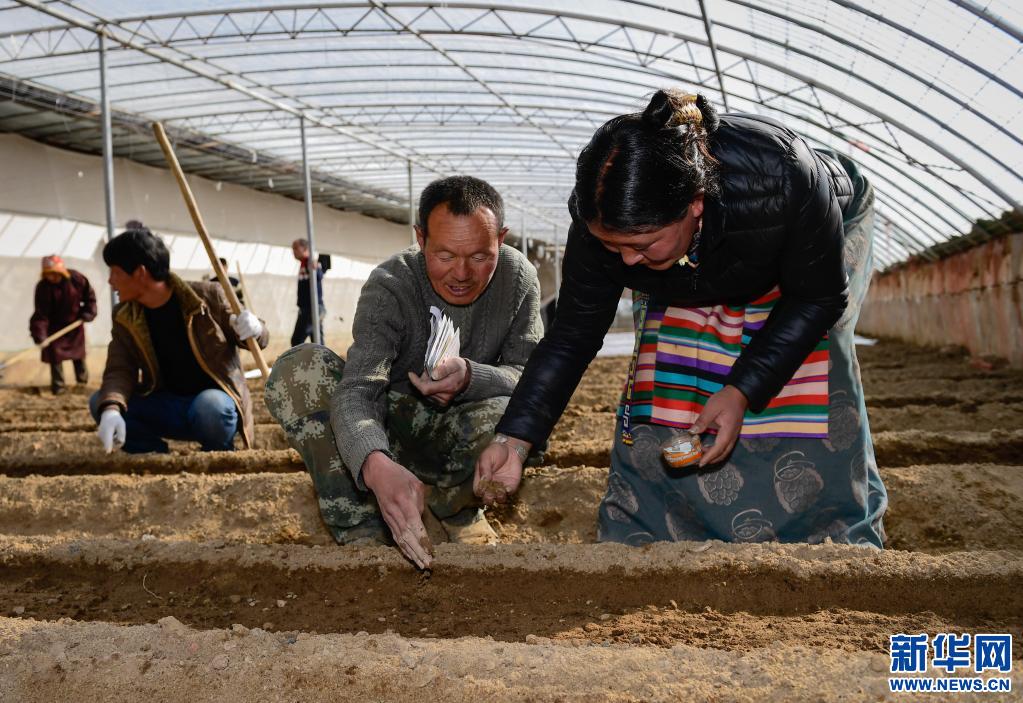 2018年3月13日,西藏阿裏地區噶爾縣生態農(nong) 業(ye) 產(chan) 業(ye) 園農(nong) 技人員楊茂錄(右二)在園區大棚中為(wei) 當地貧困戶石確桑嘎(右)傳(chuan) 授瓜果種植技術。新華社記者 劉東(dong) 君 攝
