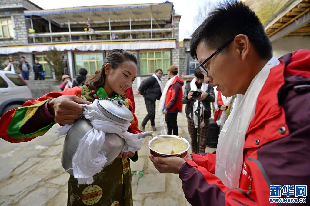 2016年11月15日,在拉薩市城關(guan) 區奪底鄉(xiang) 維巴村,身著盛裝的藏族姑娘德吉為(wei) 剛抵達她家的遊客斟滿青稞酒。德吉是特色民宿“洛奔曲闊拉薩人家”的主人。新華社記者 劉東(dong) 君 攝