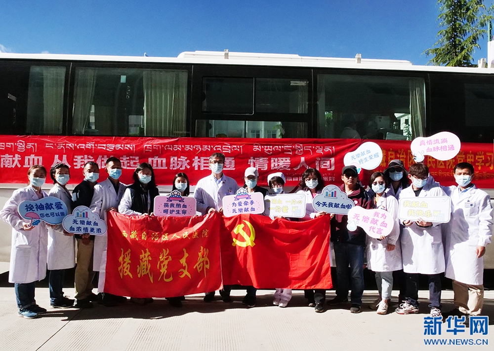 5月27日,西藏自治區人民醫院的援藏專(zhuan) 家和援藏醫生在獻血點合影。(新華網 旦增努布攝)