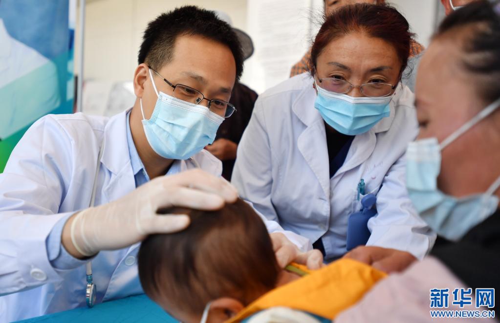 6月1日,在拉薩市人民醫院,首都兒(er) 科研究所附屬兒(er) 童醫院醫生張建昭(左)為(wei) 一名藏族孩子做檢查。新華社記者 覺果 攝