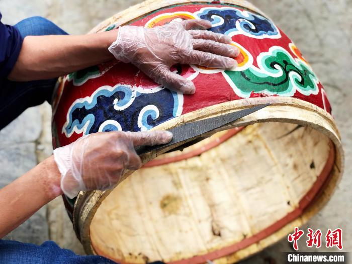 圖為(wei) 正在製作中的藏戲鼓。冉文娟 攝