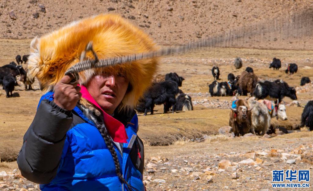 在西藏日喀則市定日縣紮西宗鄉(xiang) 藏普村的牧場裏,牧民紮西正在趕犛牛(2020年4月23日攝)。新華社記者 孫非 攝