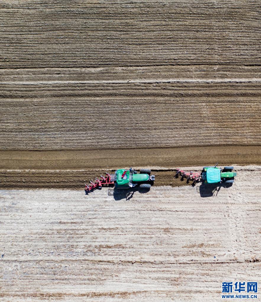 西藏拉薩市曲水縣茶巴朗村農(nong) 民利用機械設備播種“藏青2000”(無人機照片, 2020年4月22日攝)。新華社記者 普布紮西 攝