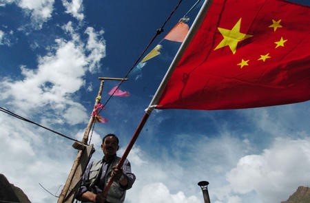 青藏鐵路沿線的藏族群眾(zhong) 紛紛掛起國旗,喜迎青藏鐵路全線通車。