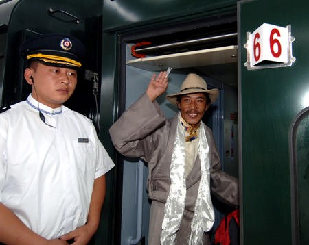2006年7月1日,第一位檢票登車的乘客——來自拉薩柳梧鄉(xiang) 的達瓦桑布——登上慶典列車後向站台上的人們(men) 揮手。