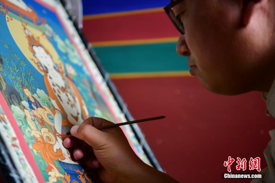 6月12日,2021年“文化和自然遺產(chan) 日”西藏非遺展演展示係列活動在拉薩舉(ju) 行。活動現場融入了文藝演出、非遺展演、非遺產(chan) 品展銷等內(nei) 容,市民遊客可親(qin) 身體(ti) 驗非遺產(chan) 品的製作過程。圖為(wei) 非遺傳(chuan) 承人在手繪唐卡。 中新社記者 貢嘎來鬆 攝