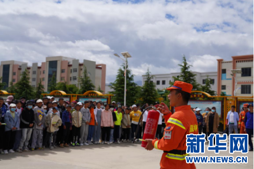 西藏森林消防總隊指戰員到西藏自治區兒(er) 童福利院教授孩子們(men) 使用滅火器(6月12日攝)。施福壽攝