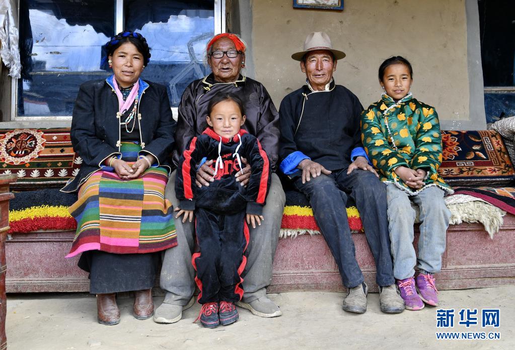 這是索朗老人和兒(er) 子紮西(右二)、孫媳婦次仁央宗(左一)及曾孫女在一起合影(4月18日攝)。新華社記者 張汝鋒 攝