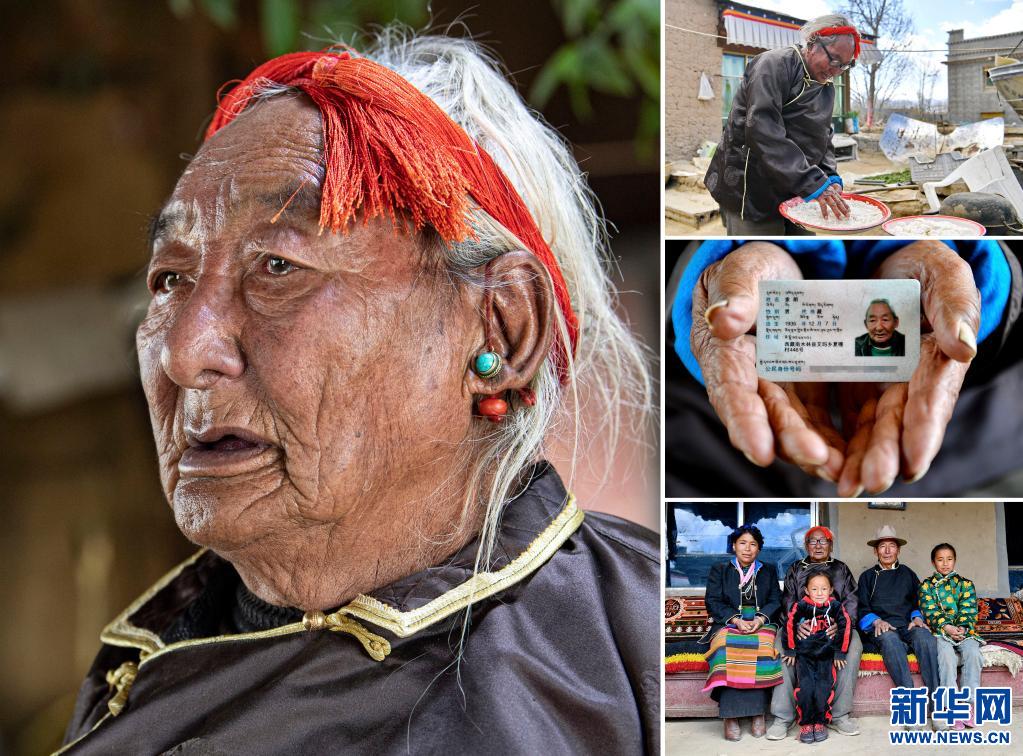 右下:這是索朗老人和兒(er) 子紮西(右二)、孫媳婦次仁央宗(左一)及曾孫女在一起合影(4月18日攝)。