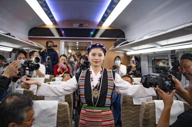 西藏首列複興(xing) 號的列車員在進行當地服飾表演(6月25日攝)。 新華社記者 普布紮西 攝
