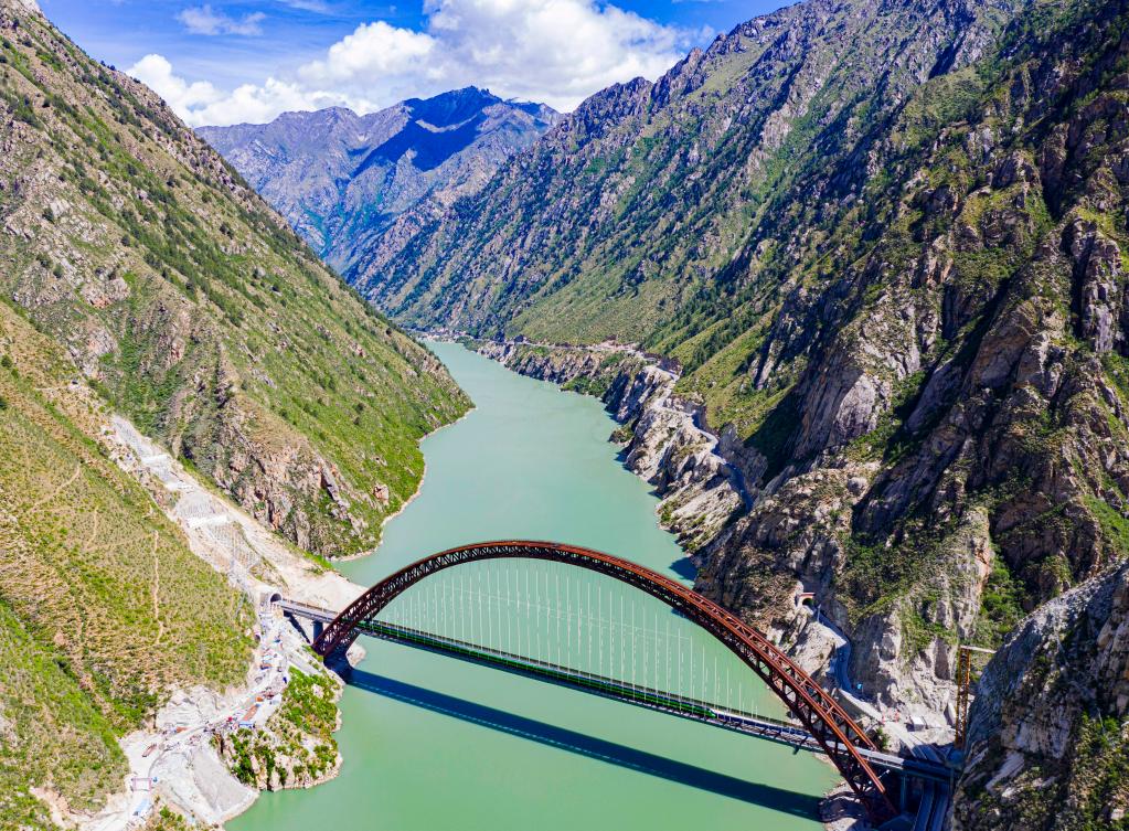 試運行的複興(xing) 號列車行駛在藏木雅魯藏布江雙線特大橋(6月17日攝,無人機照片)。新華社記者 普布紮西 攝
