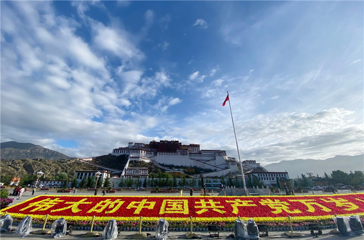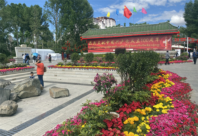 七一”前夕,走在拉薩街頭,慶祝建黨(dang) 100周年的主題標識隨處可見,布達拉宮廣場裝點一新,宗角祿康公園花團錦簇,處處洋溢著喜迎建黨(dang) 百年的濃烈氛圍。為(wei) 熱烈慶祝中國共產(chan) 黨(dang) 成立100周年,全市主次幹道、門戶立交、公園、廣場等地大型主題雕塑、立體(ti) 花雕、地麵擺花為(wei) 主要表現形式,營造建黨(dang) 百年的濃烈氛圍,美麗(li) 拉薩煥然一新,慶祝百年華誕。