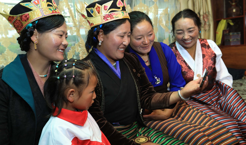西藏自治區拉薩市墨竹工卡縣群眾(zhong) 通過手機收看慶祝大會(hui) 。記者 洛桑 次旺 唐斌 潘多 攝
