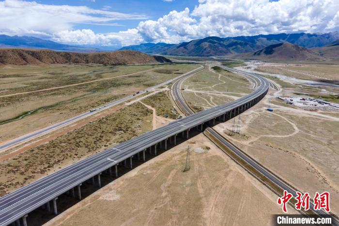 圖為(wei) 航拍G6京藏高速那曲至羊八井段,目前該段高速主線已全部完成建設,通車在即。 江飛波 攝