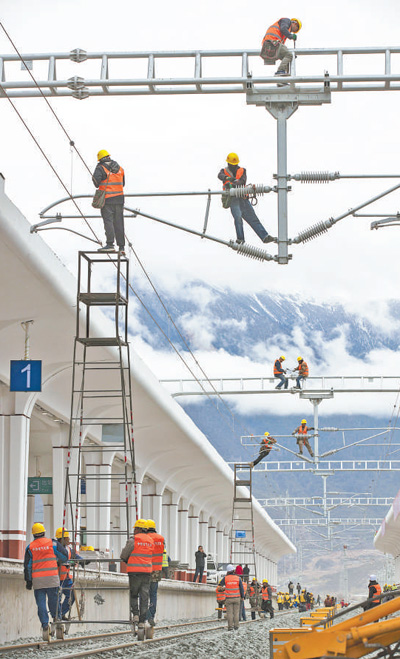 4月1日,中鐵電氣化局集團技術工人在林芝火車站進行接觸網精調作業(ye) 。焦宏濤攝(新華社發)