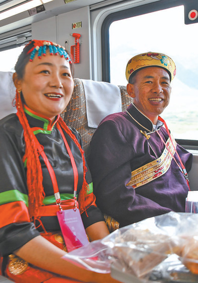 6月25日10時30分,一輛複興(xing) 號高原內(nei) 電雙源動車組駛出拉薩火車站,駛向林芝市。圖為(wei) 乘坐複興(xing) 號的乘客。新華社記者 晉美多吉攝