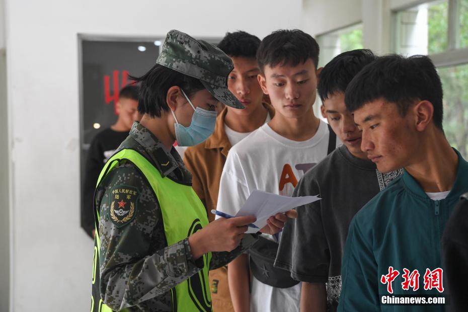 圖為(wei) 西藏自治區征兵辦工作人員正在核對體(ti) 檢人員信息。 貢嘎來鬆 攝