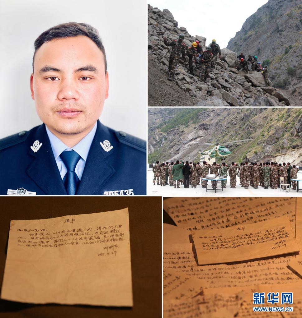 這是一張拚版照片:左上圖為(wei) 共產(chan) 黨(dang) 員、邊防戰士邵明貴;右上圖和右中圖為(wei) 邵明貴和戰友在轉移地震受災群眾(zhong) ;左下圖為(wei) 邵明貴寫(xie) 下的遺書(shu) ;右下圖為(wei) 吉隆邊防檢查站邊防戰士寫(xie) 下的遺書(shu) (資料照片)。新華社發