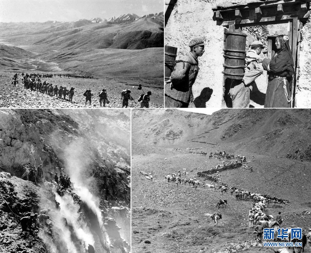 這是一張拚版照片:左上圖為(wei) 1950年,人民解放軍(jun) 戰士跋涉在高山峻嶺間向西藏前進(資料照片);右上圖為(wei) 人民解放軍(jun) 戰士在執勤空隙為(wei) 藏族老百姓背水(資料照片,張正模攝);左下圖為(wei) 築路戰士在懸崖絕壁上修建川藏公路(資料照片);右下圖為(wei) 1951年7月,解放軍(jun) 第十八軍(jun) 進藏先遣部隊行進在瓦合山上(新華社記者袁克忠攝)。新華社發