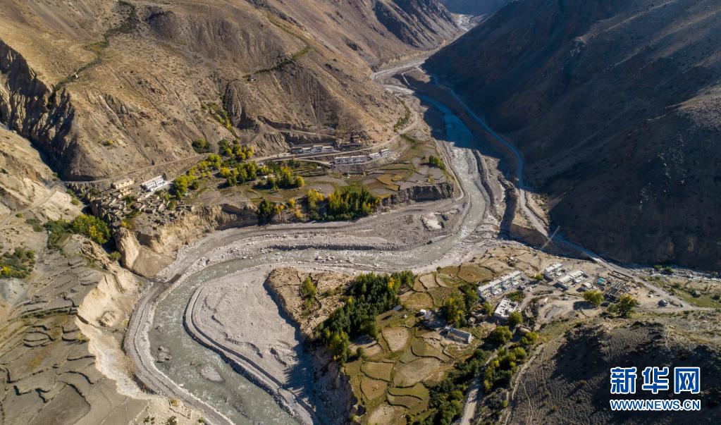 俯瞰西藏阿裏地區劄達縣楚魯鬆傑鄉(xiang) 楚鬆村楚魯組,蜿蜒的如許藏布江穿過村落(2018年9月16日攝,無人機照片)。新華社記者 旦增尼瑪曲珠 攝