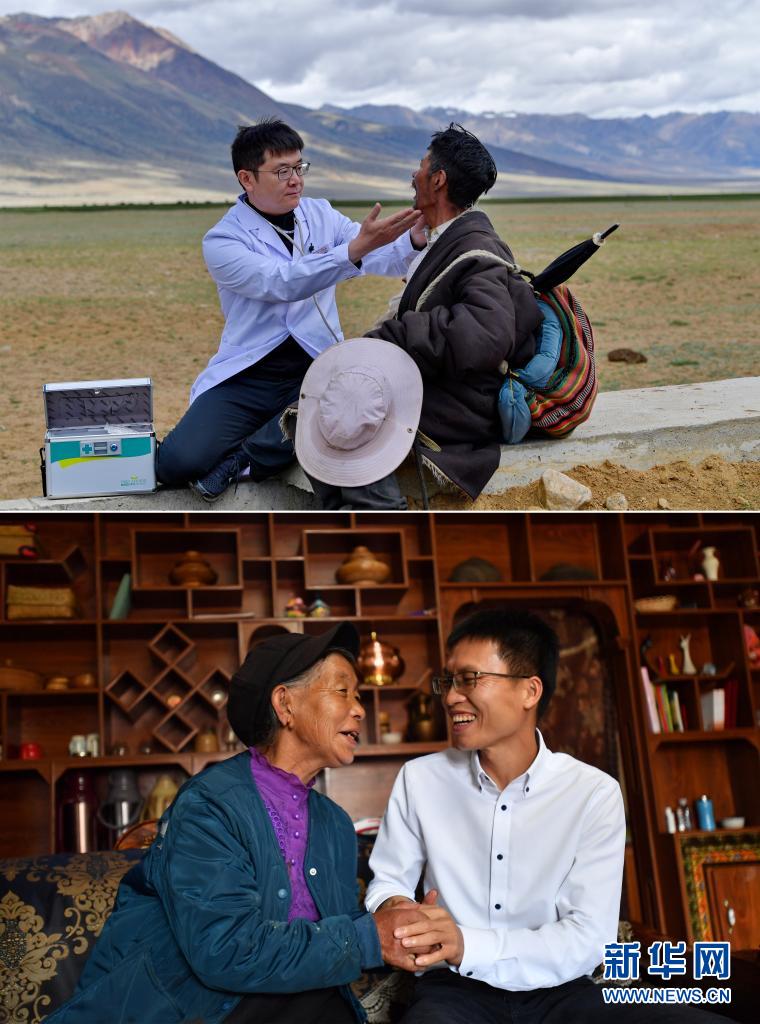 這是一張拚版照片:上圖為(wei) 北京援藏醫生王克明(左)在西藏當雄縣格達鄉(xiang) 格達村牧場為(wei) 牧民義(yi) 診(2021年6月19日攝,新華社記者張汝鋒攝);下圖為(wei) 在西藏林芝市米林縣,廣東(dong) 援藏幹部黃南蔭(右)與(yu) 珞巴族老阿媽亞(ya) 加在一起(2021年6月19日攝,新華社記者覺果攝)。新華社發