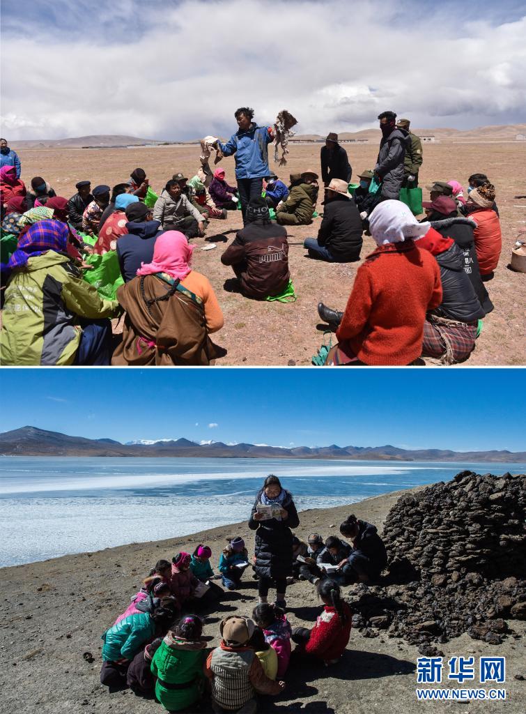 這是一張拚版照片:上圖為(wei) 瑪曲鄉(xiang) 黨(dang) 委書(shu) 記朗卡江村(中)向參加活動的村民講解如何區分可回收垃圾與(yu) 不可回收垃圾(2019年5月28日攝,新華社記者周錦帥攝);下圖為(wei) 在海拔約5000米的西藏山南市浪卡子縣堆瓦村,駐村工作隊員貢曲(中)和次仁倉(cang) 決(jue) (右一)給放假的孩子補習(xi) 功課(2017年2月9日攝,新華社記者普布紮西攝)。新華社發