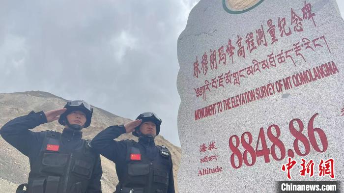 圖為(wei) 珠峰邊境派出所民警在最新高程碑前敬禮。珠峰邊境派出所供圖