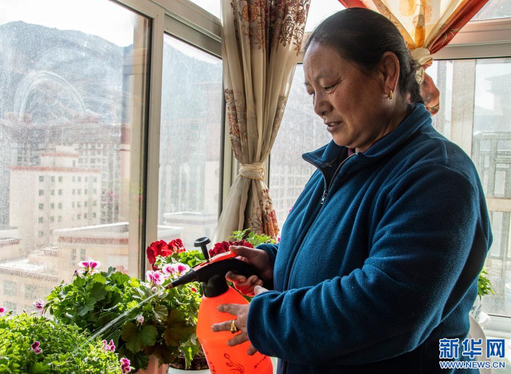 昌都市卡若區城關(guan) 鎮居民永西在新家中給花草澆水(3月25日攝)。新華社記者 陳尚才 攝