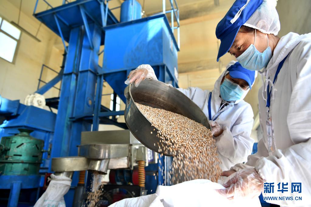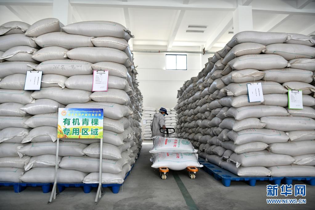 員工在洛宗特色產(chan) 品開發公司的生產(chan) 線上將烘炒好的青稞裝袋(7月24日攝)。新華社記者 李鑫 攝