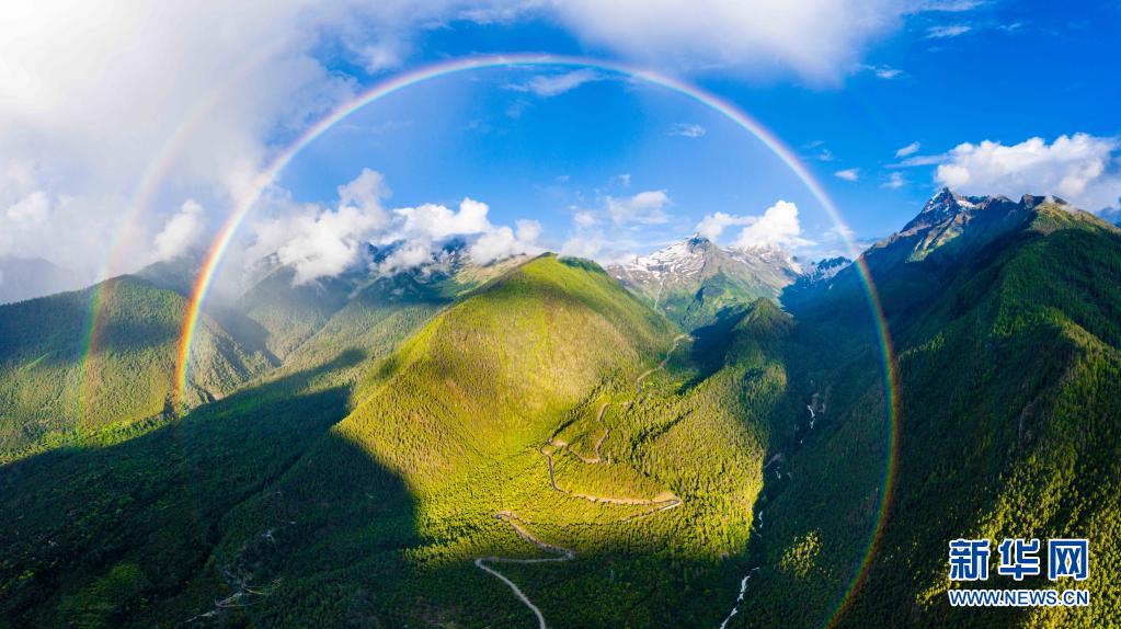 這是7月6日拍攝的米林縣派鎮至墨脫公路上的彩虹(無人機照片)。新華社發(董誌雄 攝)