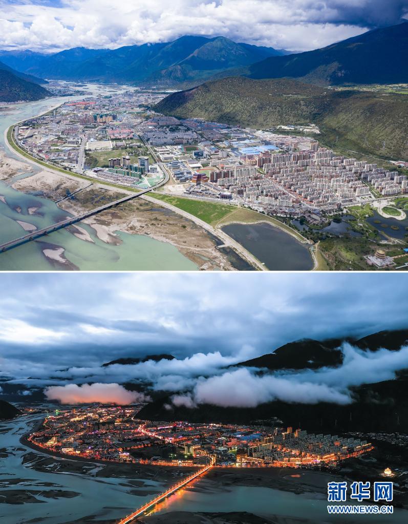 拚版照片:上圖7月19日拍攝的林芝市景色(無人機照片,新華社記者 普布紮西 攝);下圖為(wei) 6月4日拍攝的林芝市夜景(無人機照片,新華社發 董誌雄 攝)。