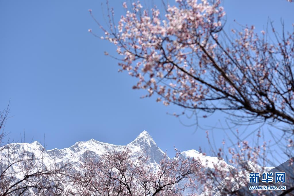 這是3月28日拍攝的桃花掩映下的南迦巴瓦峰。新華社記者 孫瑞博 攝